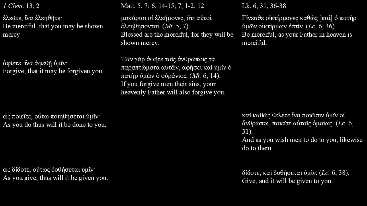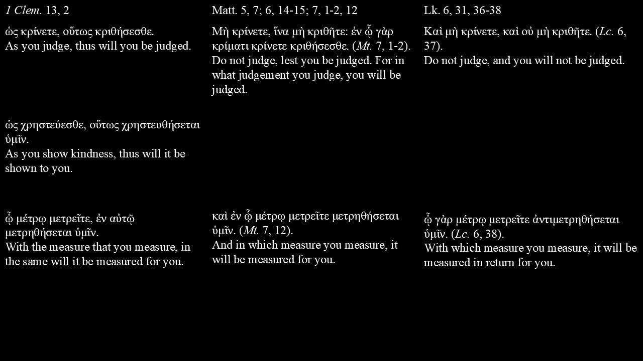 οὕτως γὰρ εἶπεν· ἐλεᾶτε, ἵνα ἐλεηθῆτε· ἀφίετε, ἵνα ἀφεθῇ ὑμῖν· ὡς ποιεῖτε, οὕτω ποιηθήσεται ὑμῖν· ὡς δίδοτε, οὕτως δοθήσεται ὑμῖν· ὡς κρίνετε, οὕτως κριθήσεσθε· ὡς χρηστεύεσθε, οὕτως χρηστευθήσεται ὑμῖν· ᾧ μέτρῳ μετρεῖτε, ἐν αὐτῷ μετρηθήσεται ὑμῖν. (1 Clem. 13, 2).